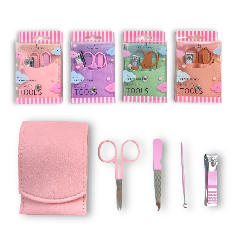 Kit de uñas x4 Ruby Face, diseñado para el cuidado y mantenimiento de las uñas de forma práctica. Incluye herramientas esenciales que ayudan a mantener las uñas limpias, con buena forma y apariencia, siendo ideal para uso personal o en casa. ✨💅