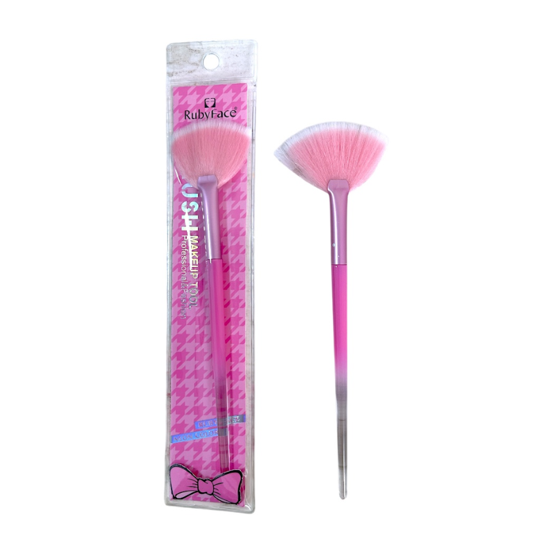 Brocha para iluminador tipo abanico Ruby Face, diseñada para aplicar iluminador de manera suave y precisa. Su forma permite distribuir el producto de forma ligera, logrando un acabado natural y luminoso en el rostro. ✨🌟