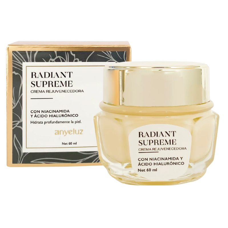 Devuélvele a tu piel juventud y vitalidad con la Crema Rejuvenecedora Radiant Supreme de Anyeluz. Su fórmula avanzada combina activos antioxidantes, péptidos reafirmantes y ácido hialurónico, ayudando a mejorar la elasticidad, reducir líneas de expresión y brindar una hidratación profunda para un rostro más luminoso y saludable.