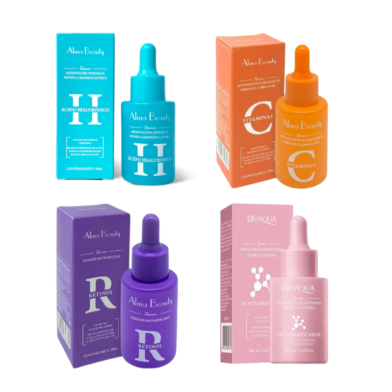 - Reduce las Manchas: El Kit 4 Sérum Antiedad Antimanchas Alma Beauty disminuye la aparición de manchas oscuras y mejora el tono de la piel.