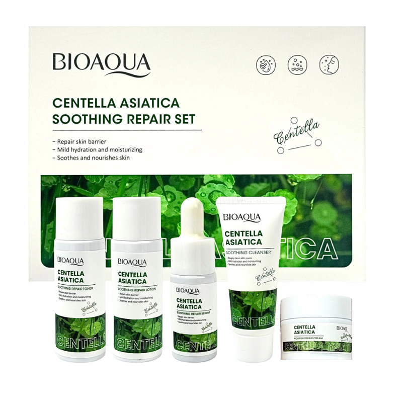 El Kit Mini de Cuidado Facial Viajero Centella Bioaqua es un set práctico diseñado para brindar una rutina completa de cuidado facial en formato compacto, ideal para viajes o uso diario. Incluye tónico, loción, sérum, crema y jabón facial, formulados con centella asiática, ingrediente reconocido por sus propiedades calmantes y equilibrantes para la piel.