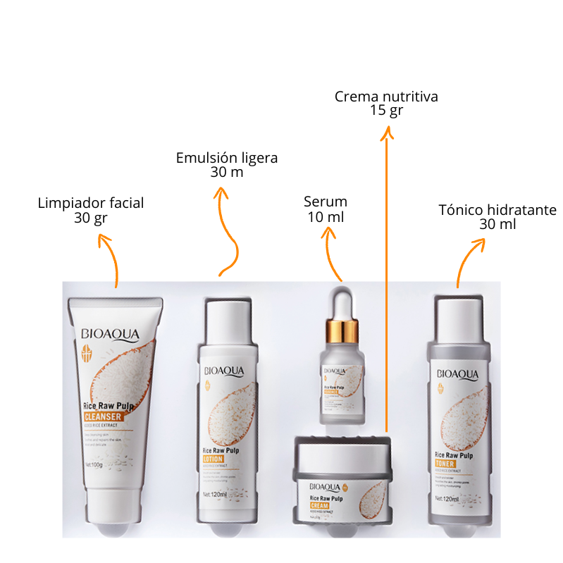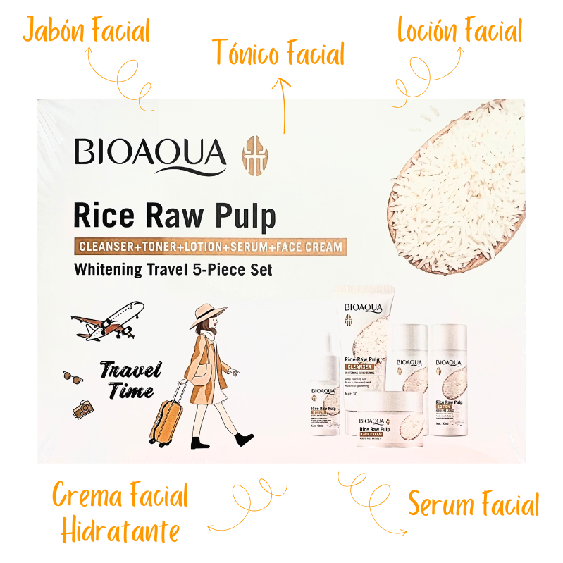 🌾 El Kit Mini de Cuidado Facial Bioaqua es ideal para llevar en viajes o probar la línea completa sin ocupar espacio. Formulado con extracto de arroz, conocido por sus propiedades iluminadoras, suavizantes y equilibrantes.