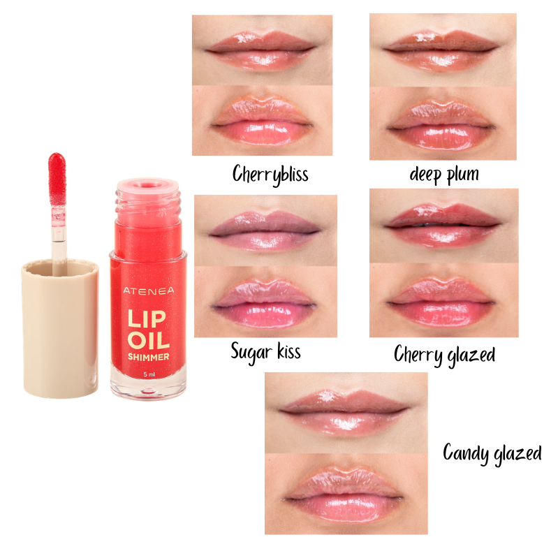 El Lip Oil Collection de Atenea es un aceite labial diseñado para hidratar, suavizar y aportar brillo a los labios mientras deja un toque de color translúcido.