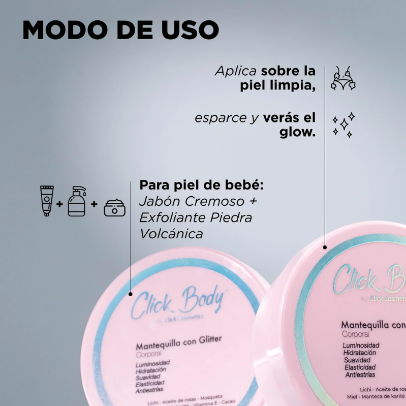 ¡Hidrata y brilla al mismo tiempo! La Mantequilla Corporal con Glitter de Click Hair es el toque perfecto para una piel radiante. Su fórmula cremosa nutre profundamente mientras deja un efecto luminoso sutil y elegante gracias a sus partículas de glitter que realzan el tono natural de tu piel.