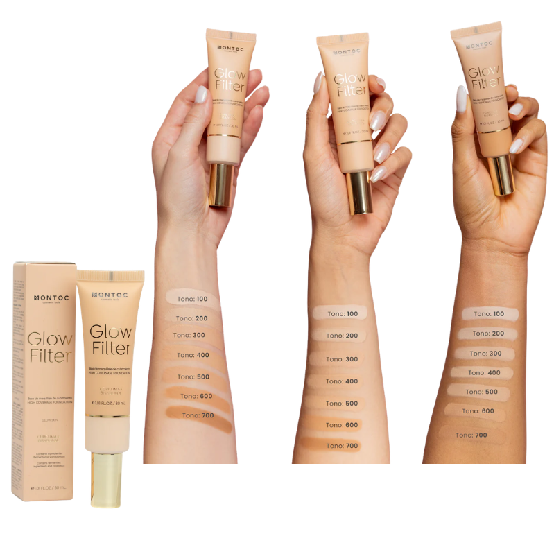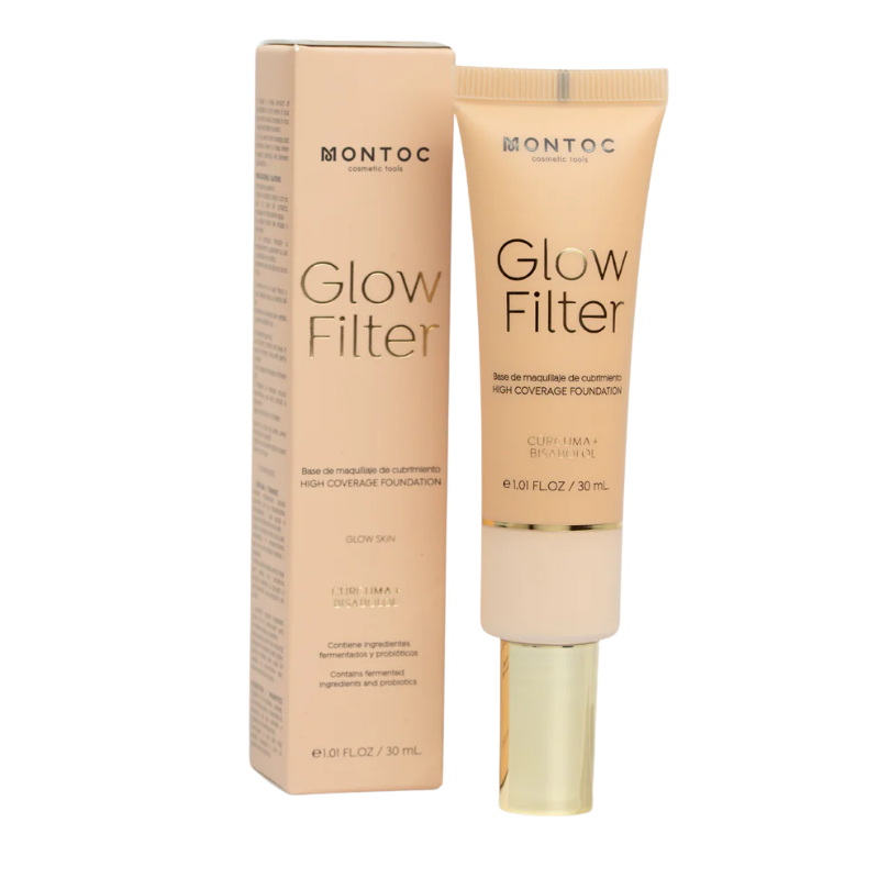 La base Glow Filter de alta cobertura de Montoc es una base líquida diseñada para unificar el tono de la piel, cubrir imperfecciones y dejar un acabado luminoso tipo “piel filtro”.