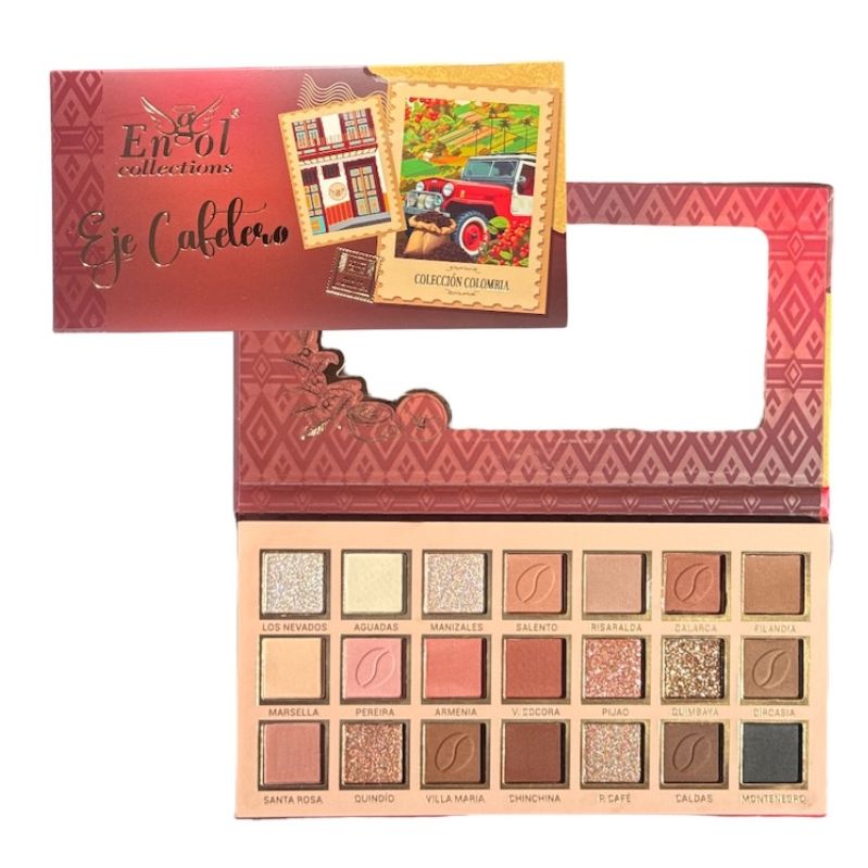 La paleta de sombras Eje Cafetero de Engol es una colección inspirada en los paisajes, colores y esencia del eje cafetero colombiano. Incluye aproximadamente 21 tonos en gamas cálidas como cafés, terracotas y dorados, pensados para resaltar la mirada con un estilo natural o glam. Sus diferentes texturas (mate, shimmer y satinadas) permiten crear múltiples looks con un acabado uniforme y fácil de difuminar.