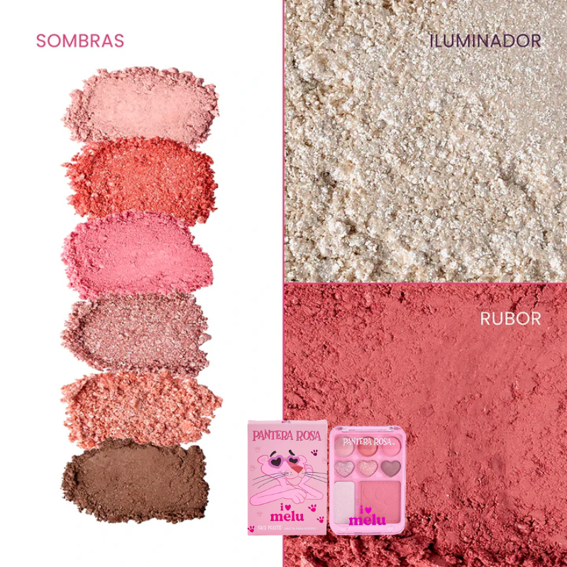 La paleta Velvet Pink Pantera Rosa de Melu es un producto multifuncional diseñado para maquillaje completo de ojos y rostro. Incluye una selección de tonos en gama rosada con diferentes acabados (mate, satinados y shimmer), ideales para crear looks románticos, frescos o más intensos. Además, incorpora tonos para rostro como rubor e iluminador, permitiendo lograr un maquillaje armonioso con una sola paleta.