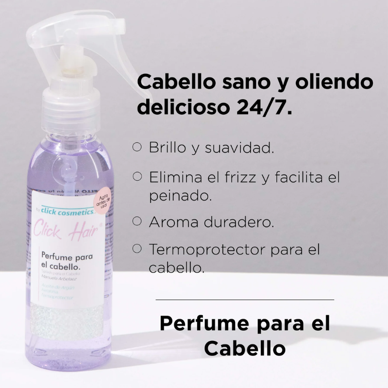 Dale a tu cabello un toque irresistible con el Perfume Capilar de Larga Duración Click Hair. Su fórmula ligera no solo deja un aroma delicioso que perdura, sino que también refresca y protege el cabello sin dejar residuos ni grasa.
