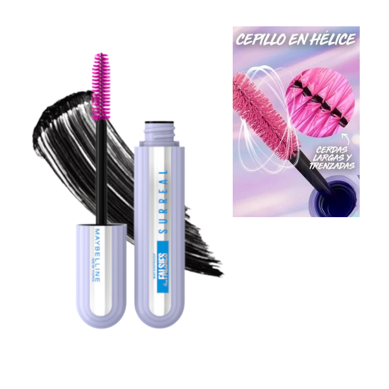 La Pestañina The Falsies Surreal Very Black Waterproof de Maybelline está diseñada para lograr un efecto de extensiones de pestañas desde la primera aplicación. Su tecnología con fibras híbridas y cepillo en forma de hélice ayuda a alargar, levantar y dar volumen a cada pestaña, creando una mirada intensa y definida con larga duración.