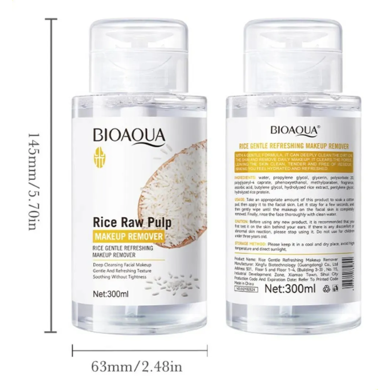 El Removedor de Maquillaje a Base de Arroz Bioaqua es un limpiador facial formulado para eliminar eficazmente el maquillaje y las impurezas del rostro, mientras ayuda a cuidar y suavizar la piel. Gracias a su contenido de extracto de arroz, contribuye a una limpieza delicada sin resecar, dejando la piel fresca y confortable.