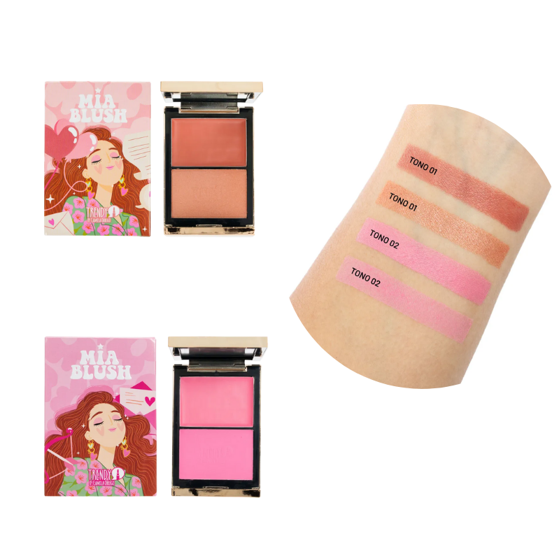 Dale color y vida a tus mejillas con el Rubor Dúo Polvo y Crema de Trendy, la combinación perfecta para un acabado natural, fresco y duradero. Ideal para lograr desde un look suave y sutil hasta uno más intenso y definido.