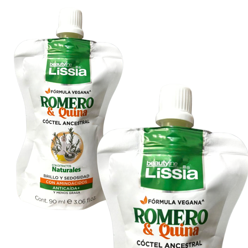 Sachet Mascarilla Cóctel Ancestral Romero y Quina Lissia de 90 ml, formulada para nutrir y fortalecer el cabello, ayudando a mejorar su apariencia y manejabilidad. Su combinación de ingredientes aporta suavidad, brillo y una sensación de cuidado intensivo ideal para complementar la rutina capilar. ✨🌿