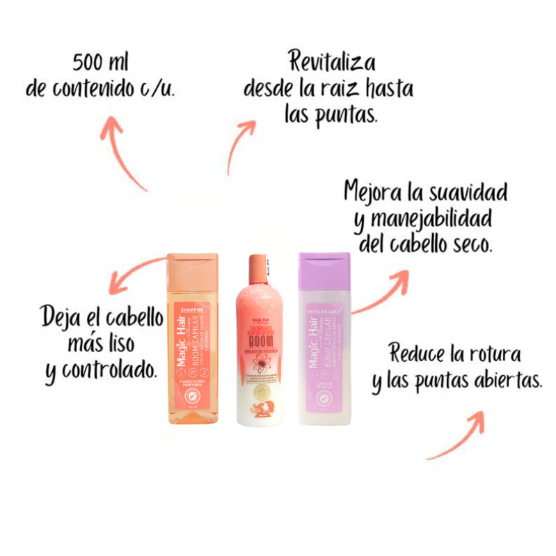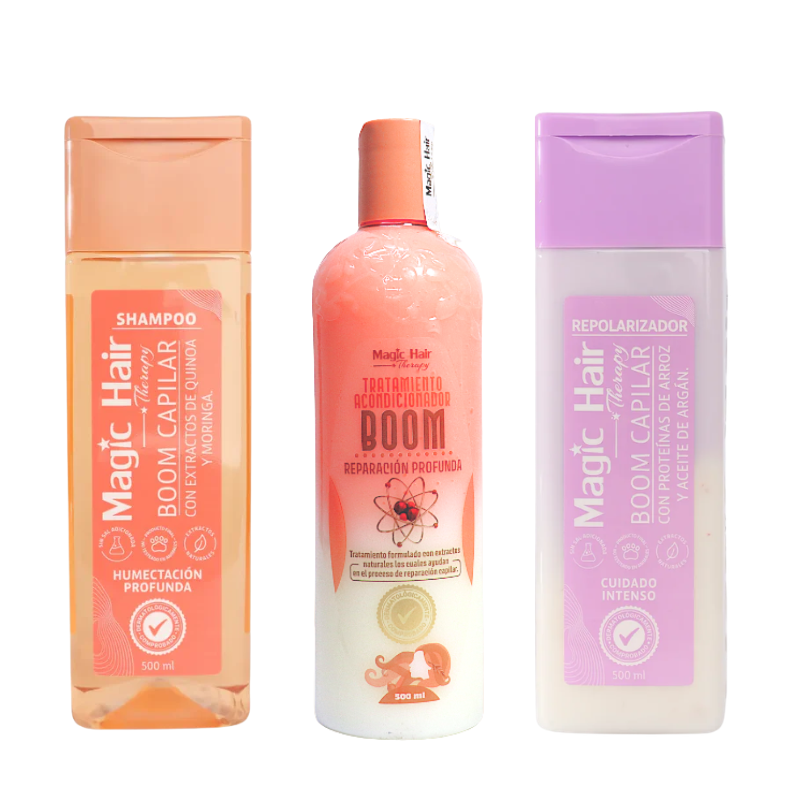 Kit Boom Capilar Magic Hair incluye shampoo, tratamiento y acondicionador intensivos para restaurar y fortalecer el cabello dañado profundamente.
