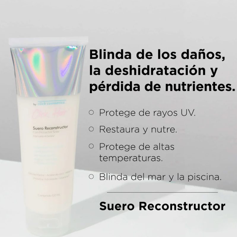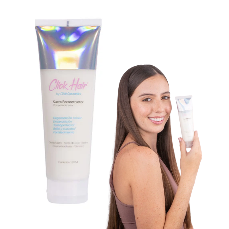 Cuida tu cabello del daño térmico mientras lo restauras desde la fibra capilar con el Suero Reconstructor Termoprotector Click Hair. Su fórmula avanzada protege del calor de planchas, secadores y rizadores, mientras repara, hidrata y sella puntas abiertas.