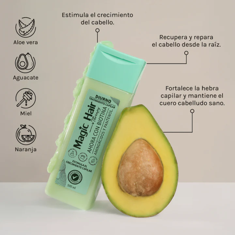 El Tratamiento Diurno Intensivo Magic Hair está formulado para fortalecer, proteger y revitalizar el cabello durante el día sin necesidad de enjuague. Su textura ligera se absorbe rápidamente sin dejar sensación pesada, ayudando a reducir el frizz, prevenir el quiebre y mejorar la apariencia del cabello debilitado. Ideal como complemento en rutinas de crecimiento y reparación capilar.