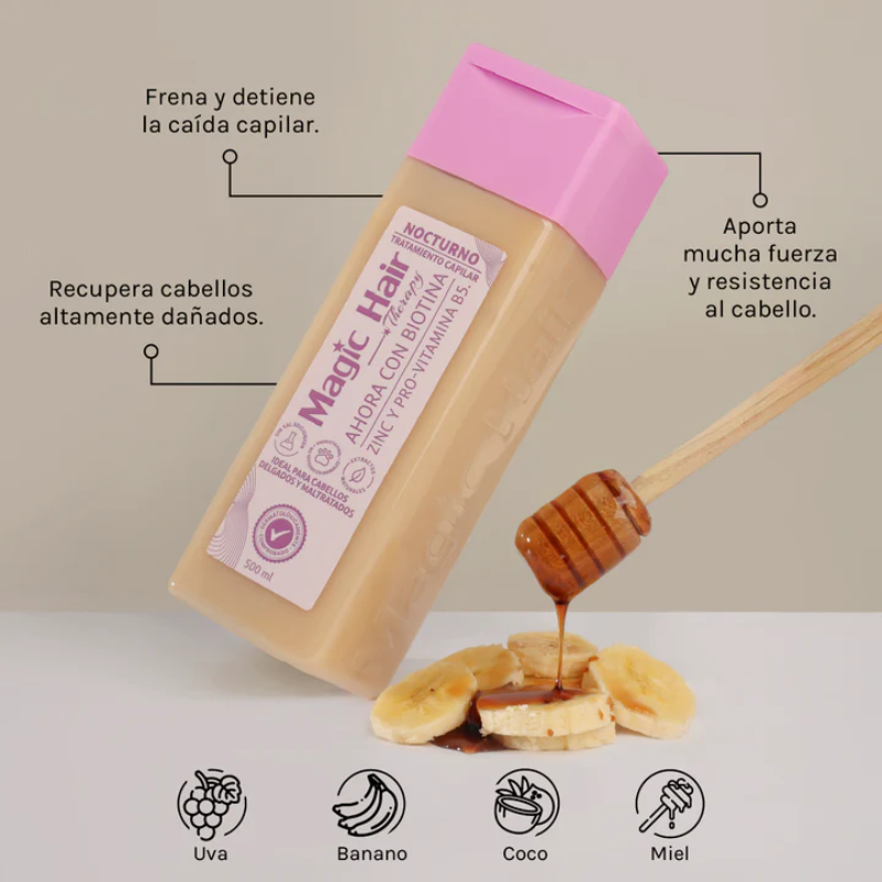 El Tratamiento Nocturno Intensivo Magic Hair está diseñado para actuar mientras duermes, ayudando a reparar, fortalecer y revitalizar la fibra capilar durante la noche. Su fórmula nutritiva penetra profundamente sin dejar sensación pesada, contribuyendo a reducir el quiebre, mejorar la elasticidad y aportar suavidad y brillo al despertar. Ideal como complemento en rutinas de crecimiento y recuperación capilar.
